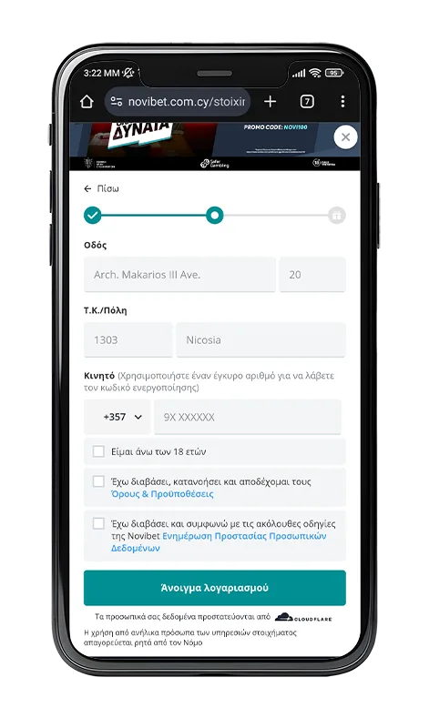Για να ολοκληρωθεί η εγγραφή, πρέπει να επιβεβαιώσετε ότι συμφωνείτε με τους όρους και τις προϋποθέσεις της στοιχηματικής. Με αυτό το βήμα επιβεβαιώνετε ότι κατανοείτε τις πολιτικές χρήσης και τους κανόνες λειτουργίας. Πολλοί παίκτες απλά πατούν αποδοχή χωρίς να διαβάσουν αναλυτικά τους κανόνες. Σας προτρέπουμε να το κάνετε, προκειμένου να γνωρίζετε σε τι συμφωνείτε.