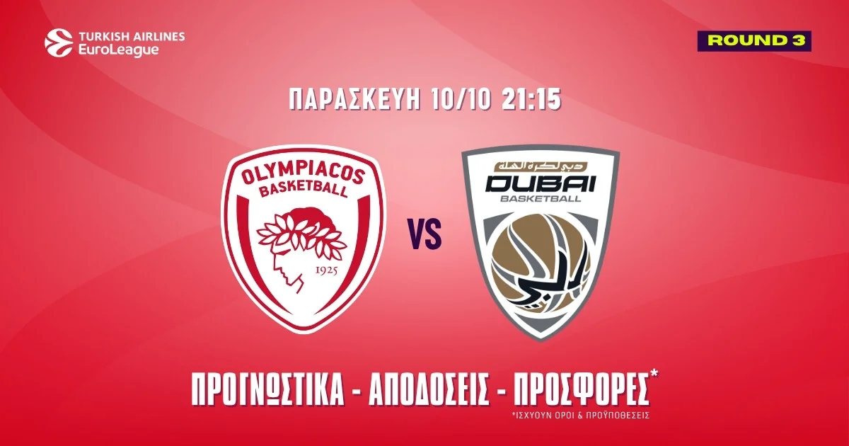Ο Ολυμπιακός αντιμετωπίζει την Ντουμπάι BC στην 3η αγωνιστική της EuroLeague και το Betmarket.com.cy έχει τα καλύτερα σημεία της αναμέτρησης στα προγνωστικά μπάσκετ.